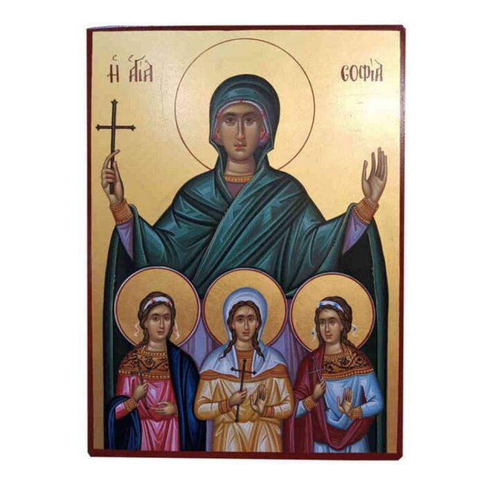 Χειροποίητη αγιογραφία, (ζωγραφισμένη στο χέρι) με την Αγία Σοφία και τις τρεις θυγατέρες της Πίστη, Ελπίδα και Αγάπη.