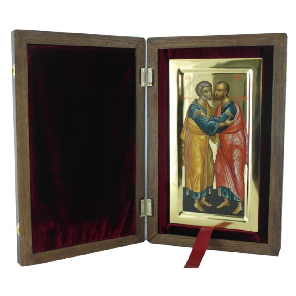 Χειροποίητη αγιογραφία με στιλβωτό χρύσωμα 24Κ, με τους Αγίους Πέτρο & Παύλο. Σε ξύλινη θήκη πολυτελείας.