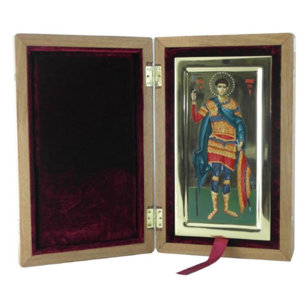 Χειροποίητη αγιογραφία με στιλβωτό χρύσωμα 24Κ, με τον Άγιο Δημήτριο. Σε ξύλινη θήκη πολυτελείας.