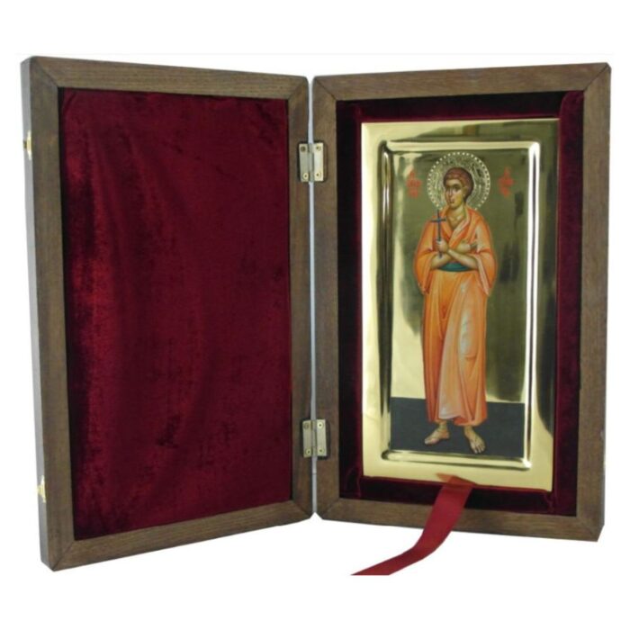 Χειροποίητη αγιογραφία με στιλβωτό χρύσωμα 24Κ, με τον Άγιο Ιωάννη τον Ρώσσο. Σε ξύλινη θήκη πολυτελείας.