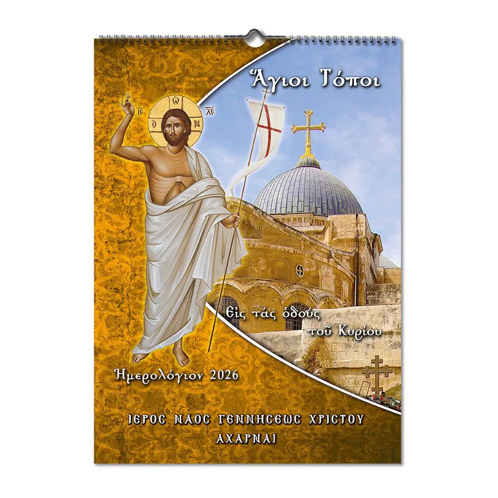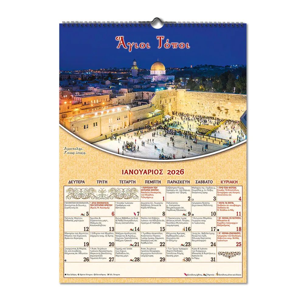 Μηνιαίο ημερολόγιο 2026 σπιράλ, αφιέρωμα στους Αγίους Τόπους. Περιλαμβάνει εορτολόγιο και νηστείες.