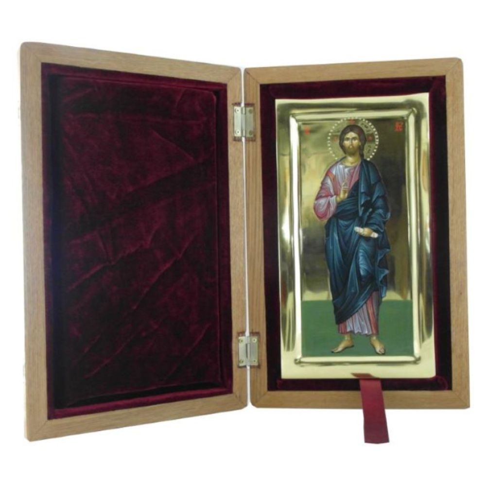 Χειροποίητη αγιογραφία με στιλβωτό χρύσωμα 24Κ, με τον Ιησού Χριστό. Σε ξύλινη θήκη πολυτελείας.