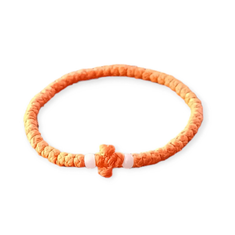 Κομποσχοίνι κερωμένο με σφιχτούς κόμπους για τον καρπό, με πλεκτό σταυρό στο κέντρο, σε χρώμα πορτοκαλί