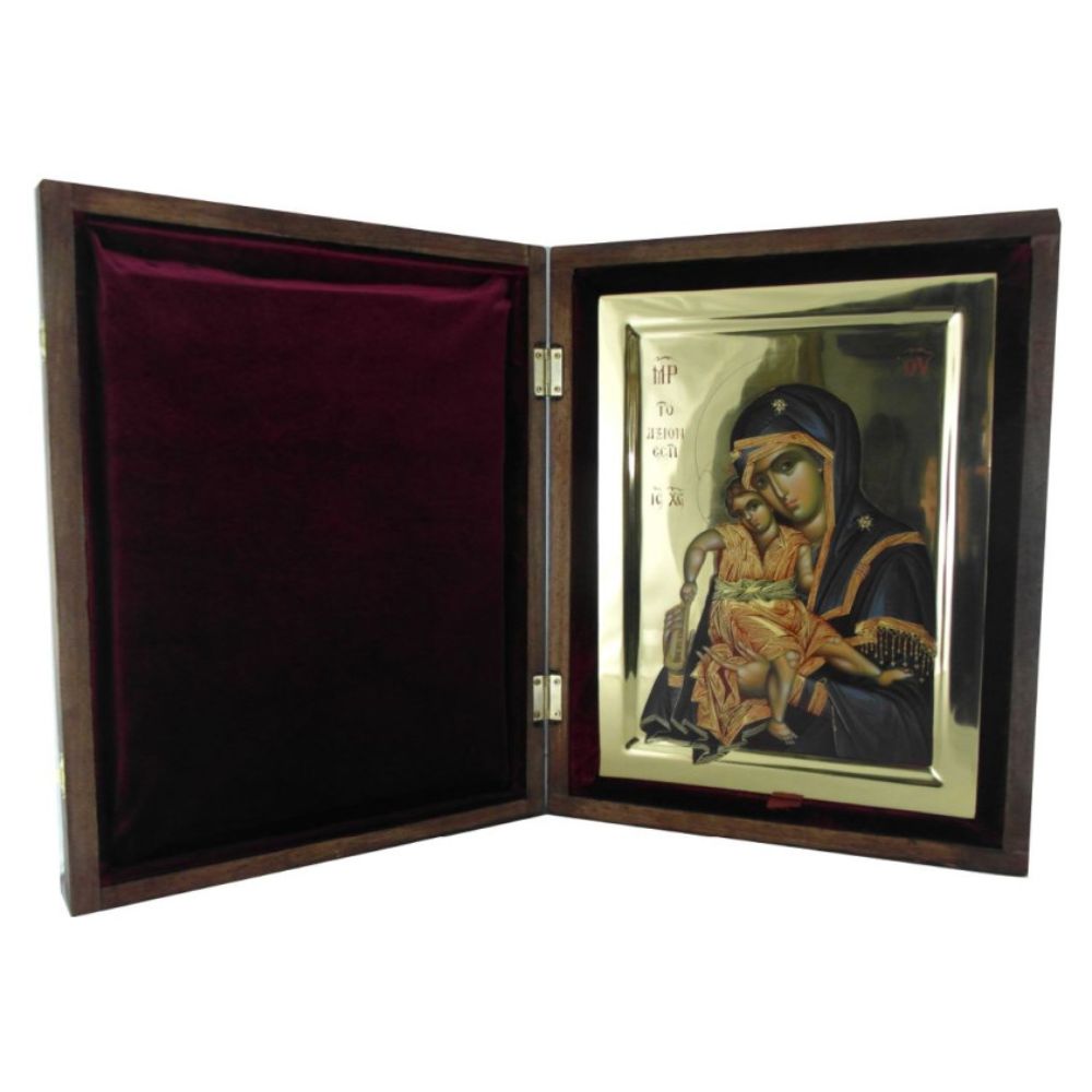 Χειροποίητη αγιογραφία με στιλβωτό χρύσωμα 24Κ, με την Παναγία το Άξιον Εστί. Σε ξύλινη θήκη πολυτελείας.