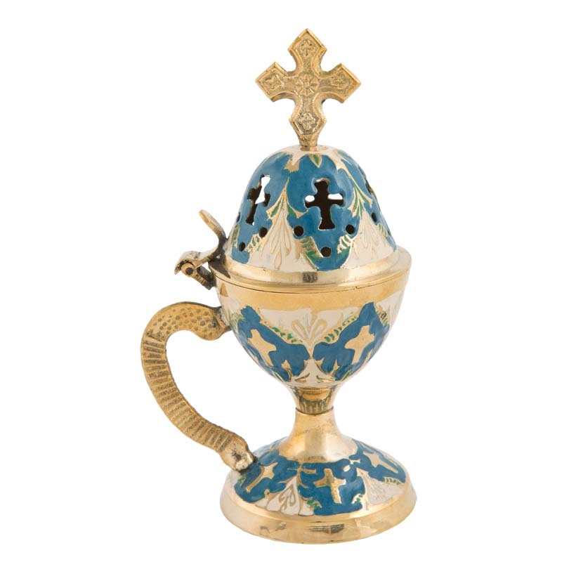 Μπρούτζινο οικιακό θυμιατό με επίστρωση σμάλτου σε μπλε-λευκό χρώμα.