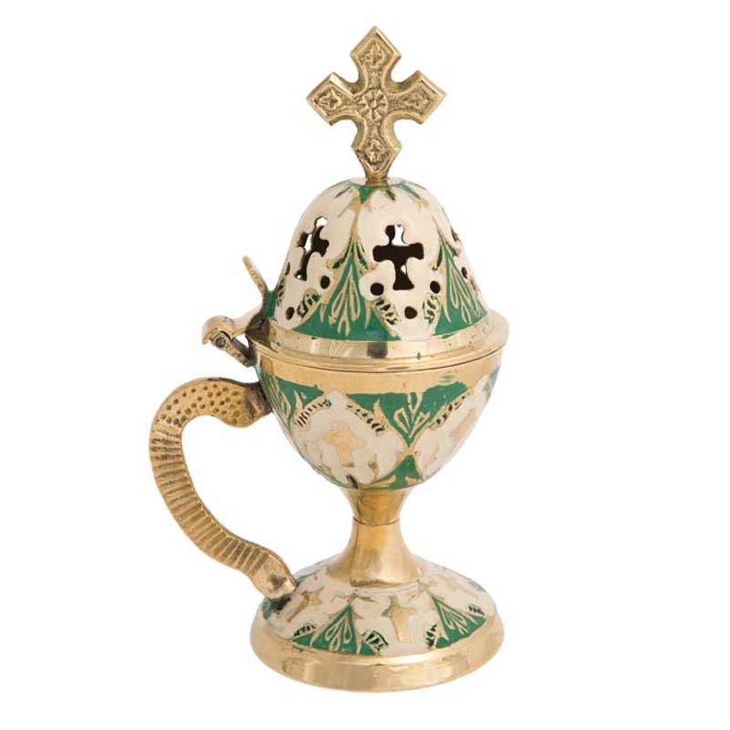 Μπρούτζινο οικιακό θυμιατό με επίστρωση σμάλτου σε πράσινο-λευκό χρώμα.
