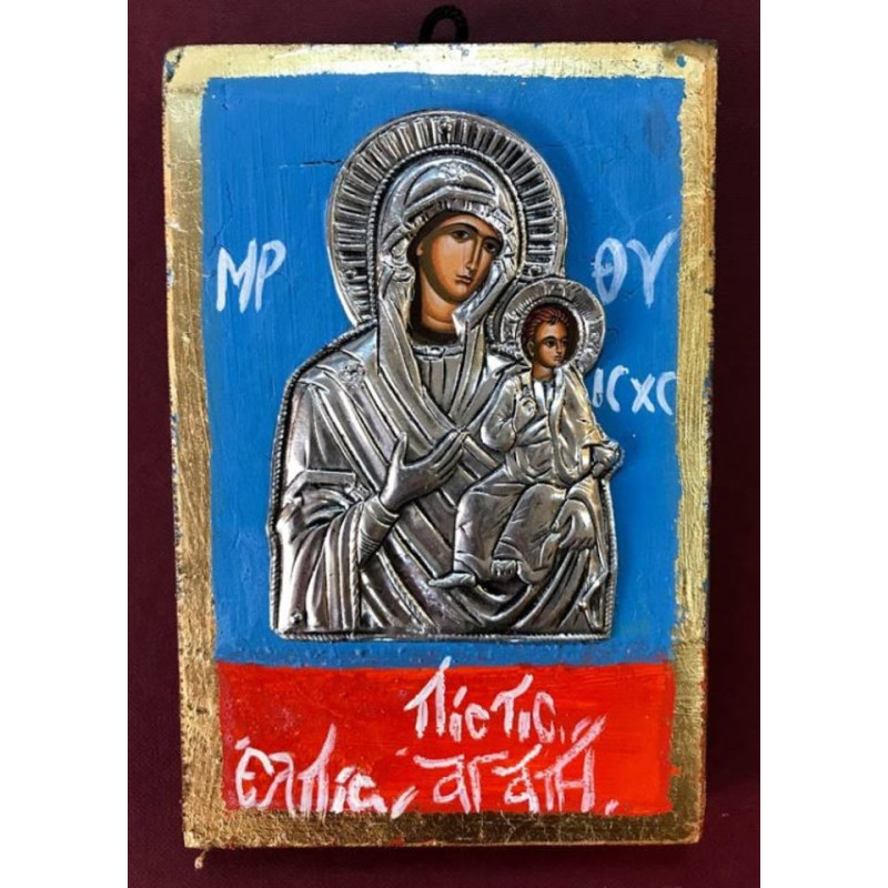 Παναγία – Ασημένια εικόνα με μεταξοτυπία