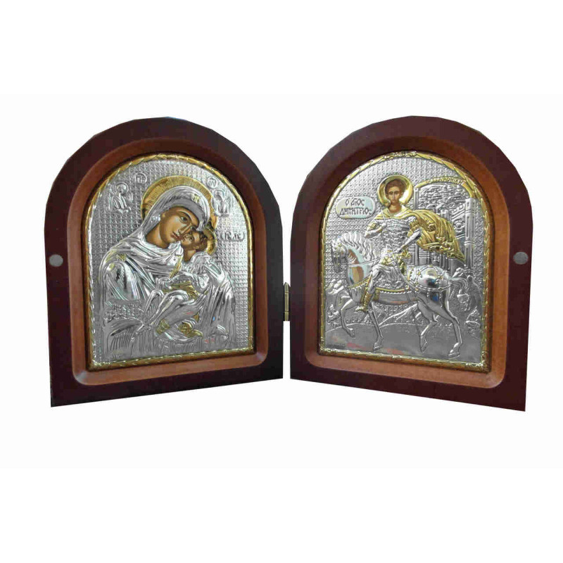 Δίπτυχο με την Παναγία και τον Άγιο Δημήτριο. Ακριβές αντίγραφο ασημένιας ορθόδοξης εικόνας, φιλοτεχνημένη σε μουσαμά, με γνήσια χρώματα αγιογραφίας αναλλοίωτα στο χρόνο. Το προϊόν είναι σφραγισμένο με το βάρος του καθαρού αργύρου 999° (Ag.). Επικαλυμμένο με ειδικό βερνικί προστασίας.