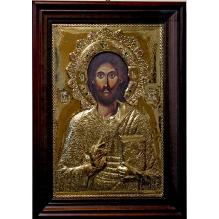 Ασημένια εικόνα σε ξύλινη κορνίζα με τον Ιησού Χριστό. Aντίγραφον Θαυματουργής Εικόνος Iησού Χριστού Παντοκράτωρος, Ιεράς Μεγίστης Μονής Βατοπεδίου.