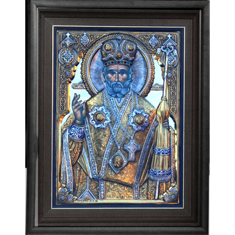 Εικόνα από καθαρό ασήμι με τον Άγιο Νικόλαο Καρυών σε κορνίζα-τζάμι διαστάσεων 30×40 εκ.