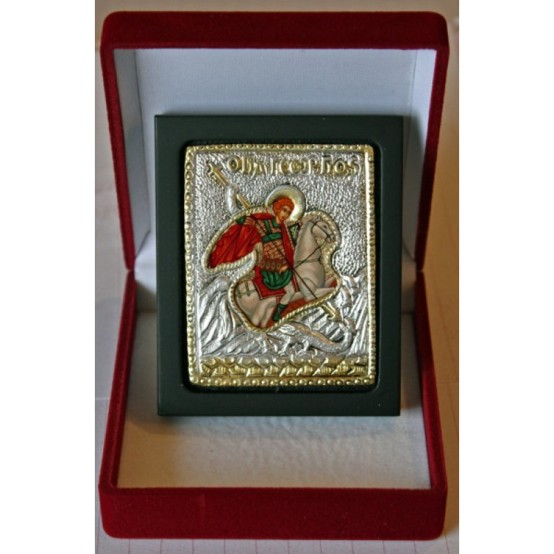 Ασημένια εικόνα με μεταξοτυπία (με χρυσό διάκοσμο) με τον Άγιο Γεώργιο. Σε θήκη πολυτελείας.
