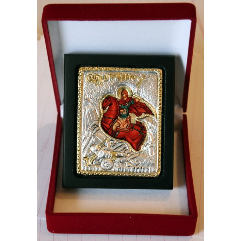 Ασημένια εικόνα με μεταξοτυπία (με χρυσό διάκοσμο) με τον Άγιο Δημήτριο. Σε θήκη πολυτελείας.