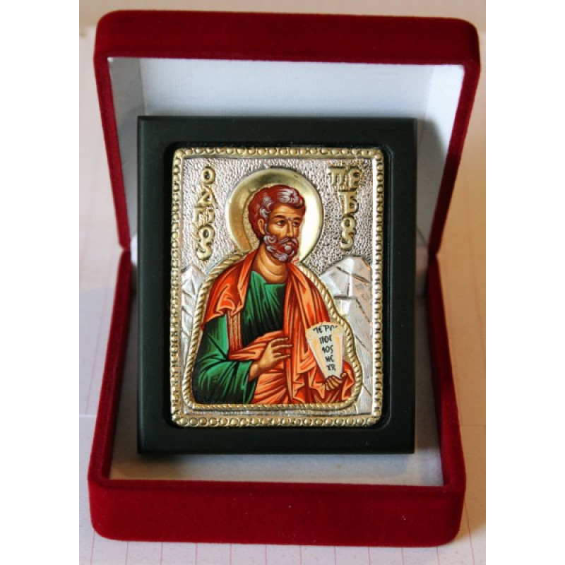 Ασημένια εικόνα με μεταξοτυπία (με χρυσό διάκοσμο) με τον Άγιο Πέτρο. Σε θήκη πολυτελείας.