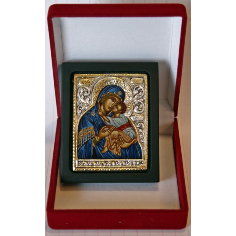 Ασημένια εικόνα με μεταξοτυπία (με χρυσό διάκοσμο) με την Παναγία την Γλυκοφιλούσα. Σε θήκη πολυτελείας.