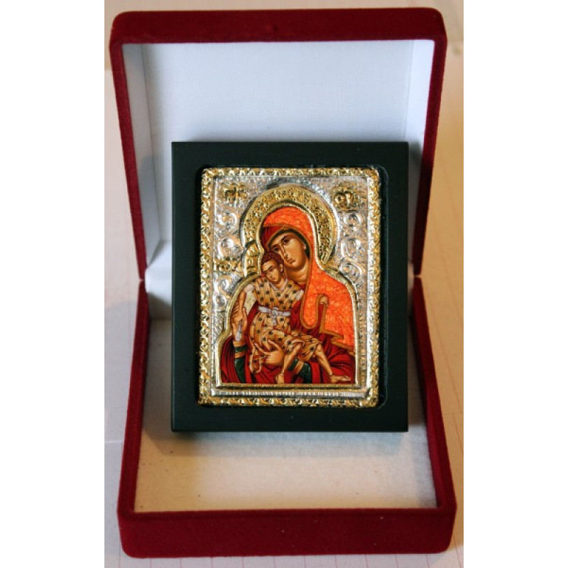 Ασημένια εικόνα με μεταξοτυπία (με χρυσό διάκοσμο) με την Παναγία την Κυκκότισσα. Σε θήκη πολυτελείας.