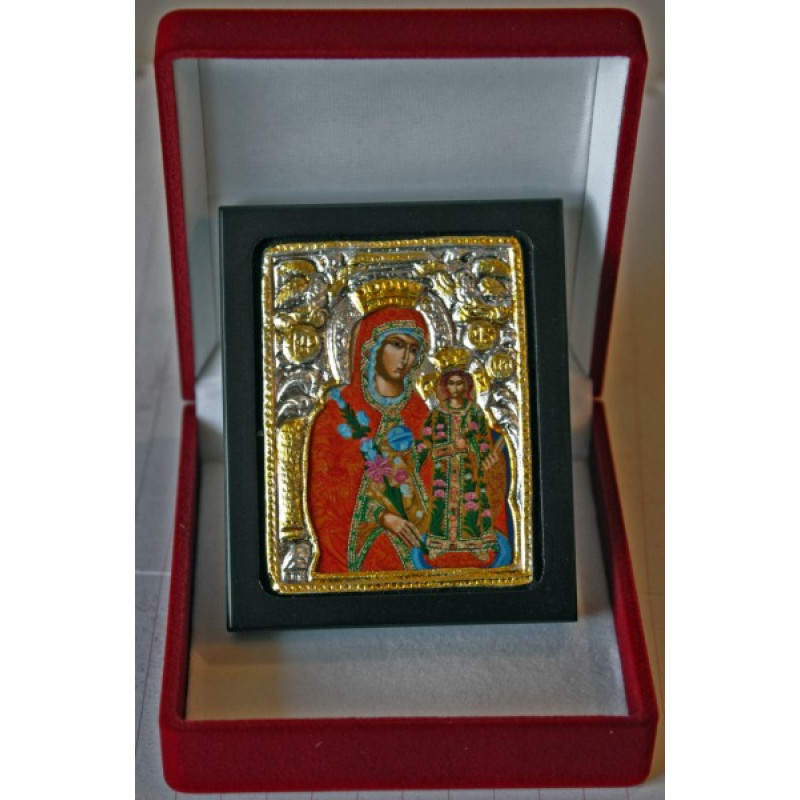 Ασημένια εικόνα με μεταξοτυπία (με χρυσό διάκοσμο) με την Παναγία το Ρόδον το Αμάραντον. Σε θήκη πολυτελείας.