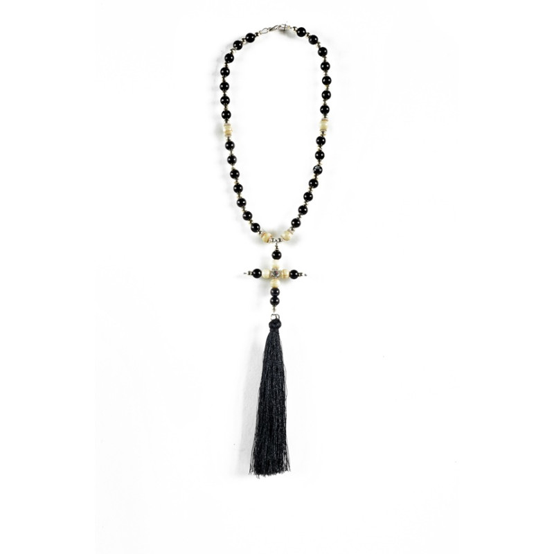 Κρεμαστός Σταυρός αυτοκινήτου με χάντρες, σταυρουδάκι στο κέντρο και μαύρη πλέξη.