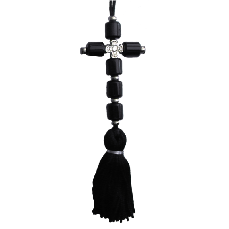 Κρεμαστός σταυρός αυτοκινήτου με μαύρες πέρλες, ασημί σταυρουδάκι στο κέντρο και μαύρη πλέξη.