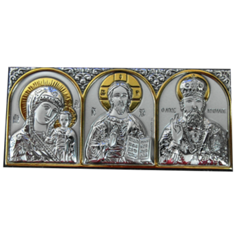 Διμεταλλική εικόνα με αυτοκόλλητο από την πίσω πλευρά για το αυτοκίνητο με την Υπεραγία Θεοτόκο, τον Ιησού Χριστό και τον Άγιο Νικόλαο.