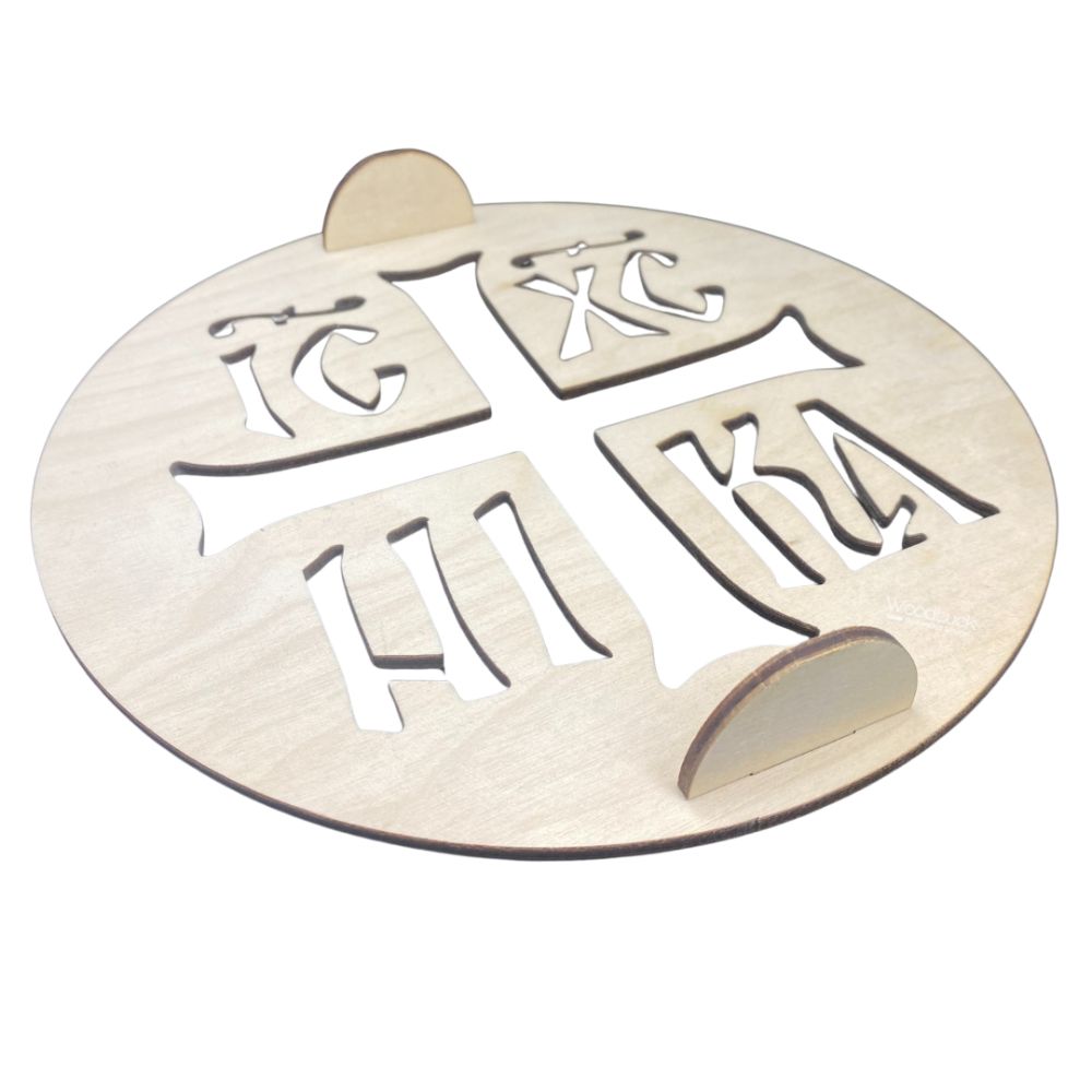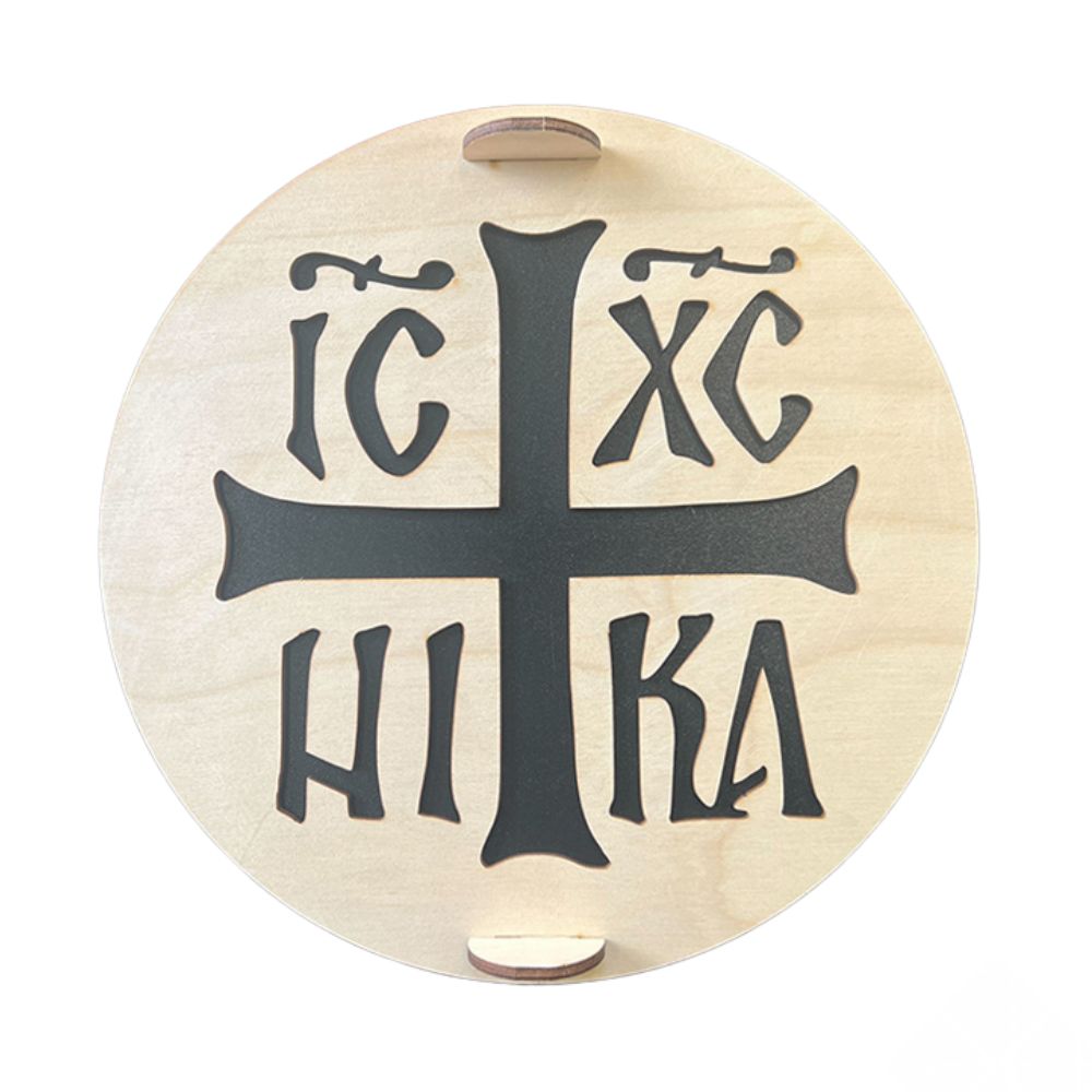 Σφραγίδα ξύλινη για Κόλλυβα στρογγυλή, διαθέτει σχέδιο με σταυρό στη μέση, ενώ περιμετρικά αναγράφει “IC XC NIKA”.