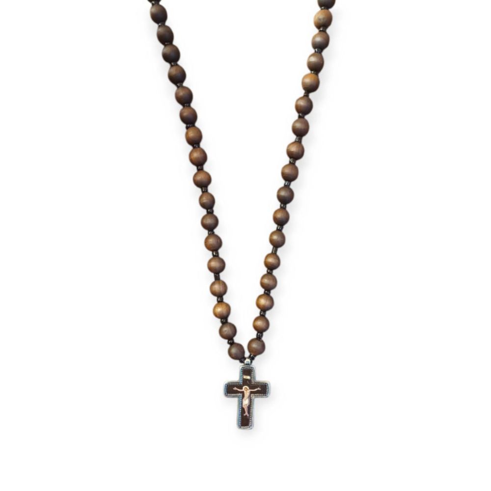 Σταυρός λαιμού με ξύλινες χάντρες και μεταλλικό σταυρό με τον Ιησού Χριστό