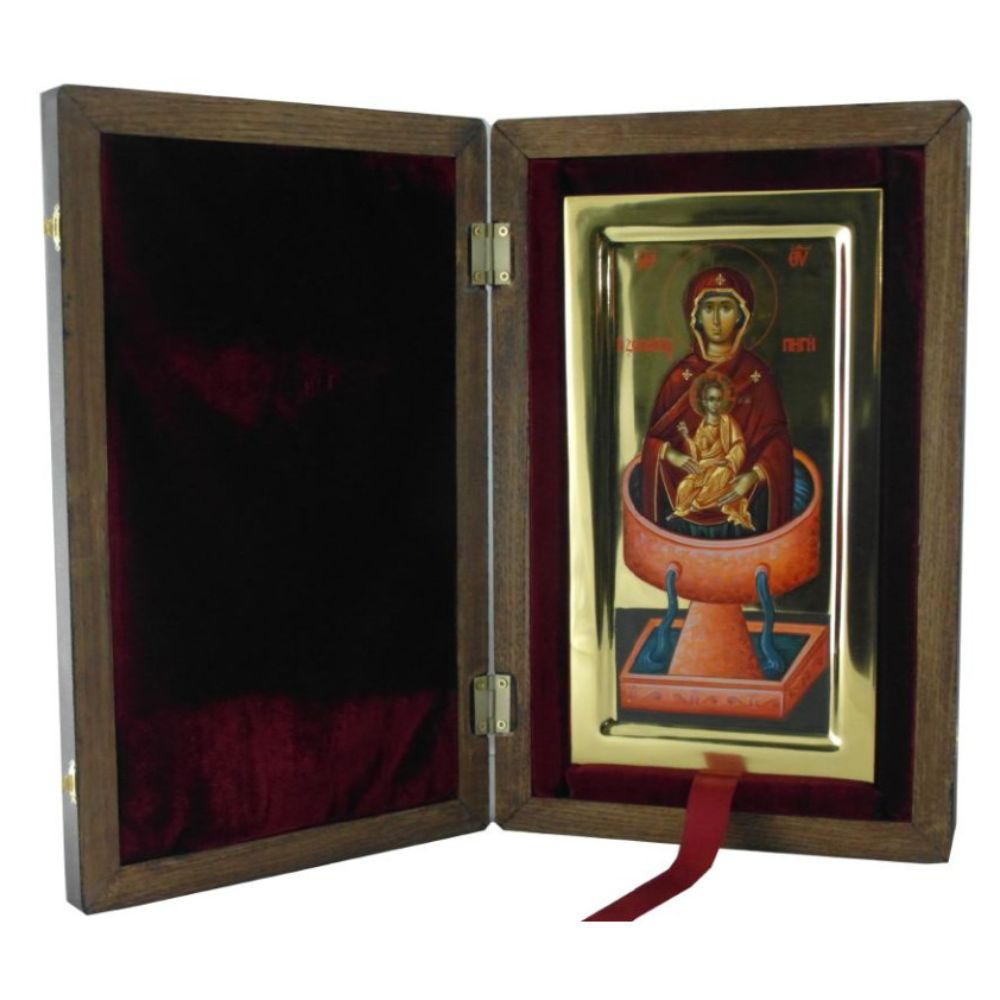 Χειροποίητη αγιογραφία με στιλβωτό χρύσωμα 24Κ, με την Ζωοδόχο Πηγή. Σε ξύλινη θήκη πολυτελείας.