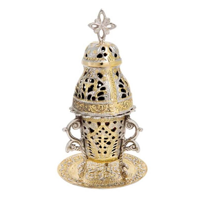 Επιτραπέζιο δίχρωμο (μπρούτζινο-νίκελ) σκαλιστό οικιακό καντήλι με πιατάκι